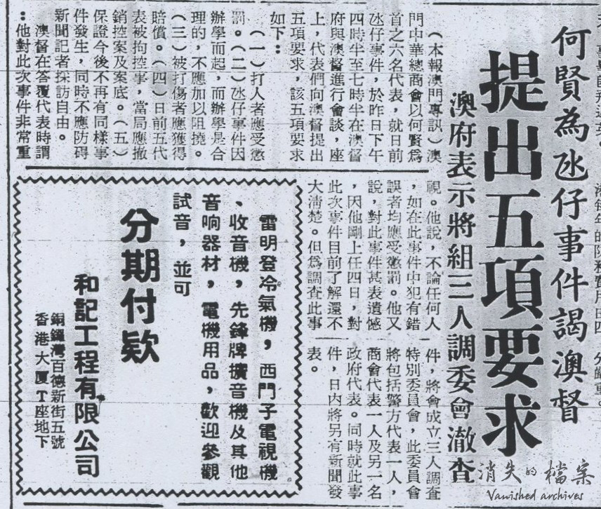 以何賢為首的六名代表,11月29日下午謁見澳督,提出五項要求: