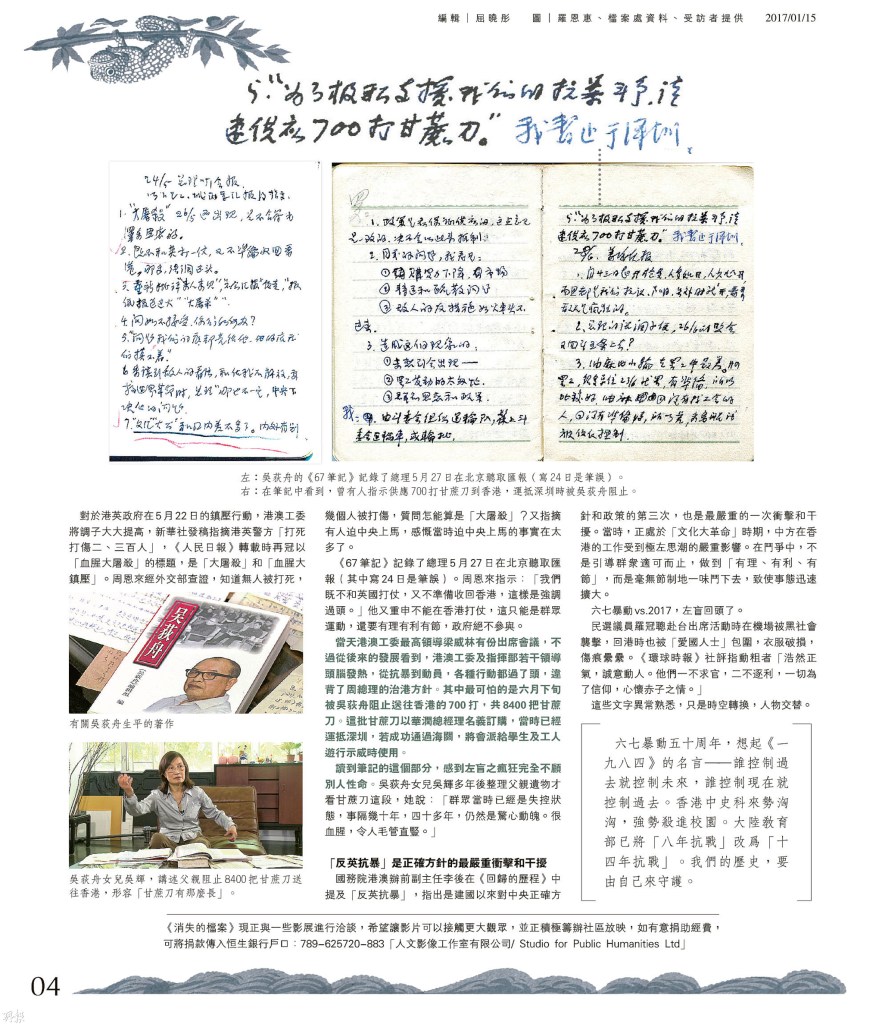 面對中央文革及造反派層出不窮的衝擊,總理周恩來非常被動。但對於反英抗暴,總理一直知情,吳荻舟帶在身邊,記錄開會重點的《67筆記》,是重要歷史紀錄。這本筆記不及巴掌般大,已經沒有封面和封底,僅存84頁,記錄「港辦」由1967年5月26日至8月8日之間的開會重點。