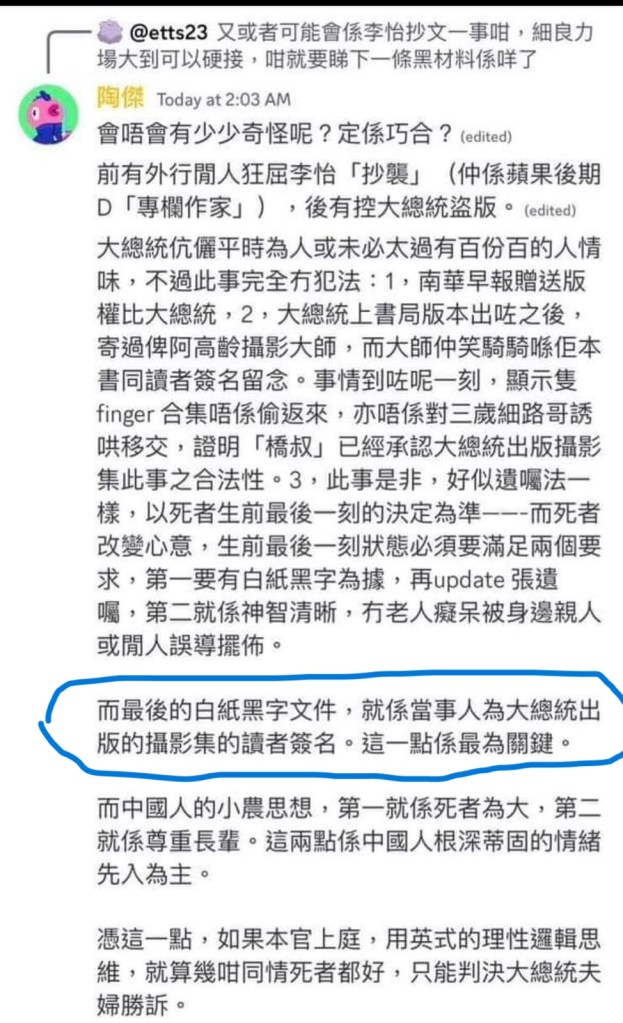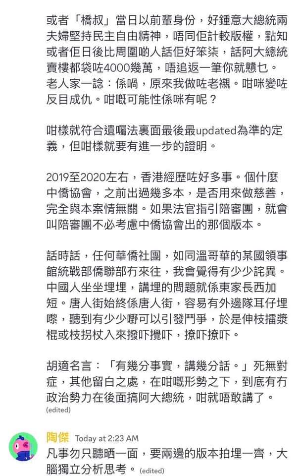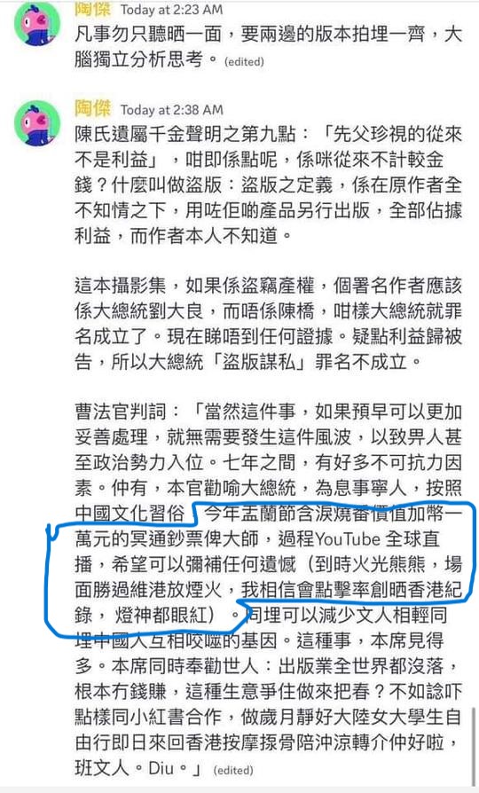 如果聲討侵權事件的都是LOSER,是中共打手,妒忌教主偉大成就。又或者事件像才子自許「法官」,將詐騙老人的夫妻封為「大總統」,滿紙荒唐,還戲謔「今年盂蘭節含淚燒番價值加幣一萬元的冥通鈔票比大師,過程YouTube全球直播。」所謂意見領袖將2017年侵權事件,說成陳橋貪圖劉細良夫婦2021年賣樓收益。以江湖術士之姿混淆是非、顛倒黑白,製造彌天大謊。不過在眾人眼中卻是「窮得只剩下錢」。