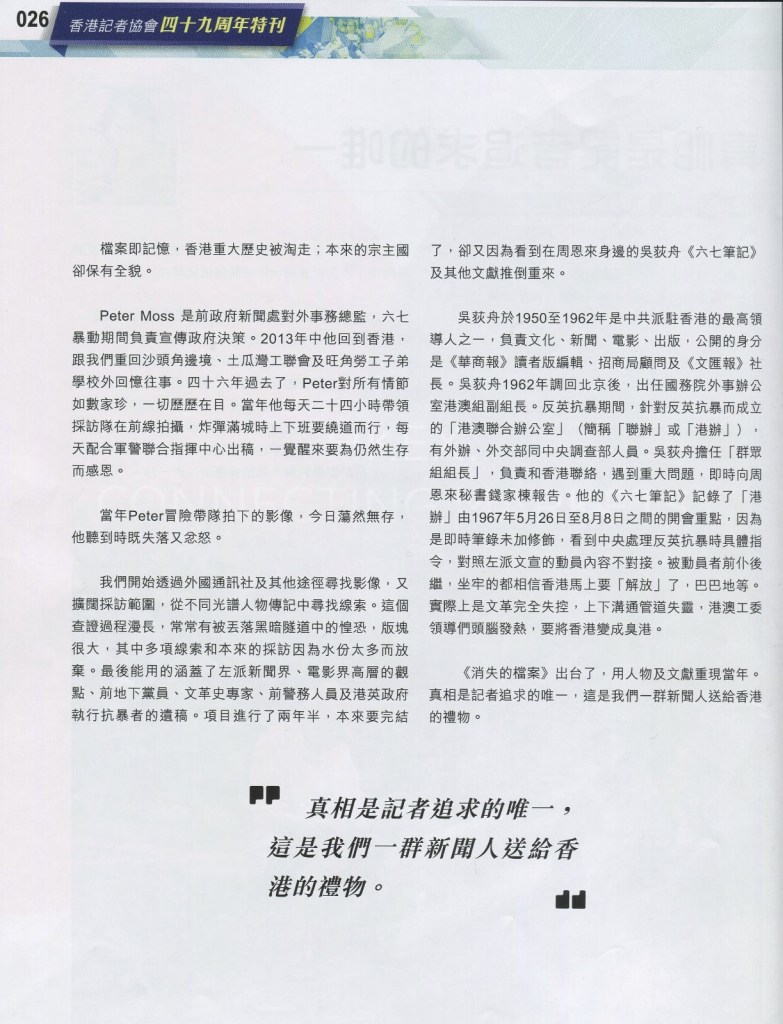 2017年六七暴動紀錄片《消失的檔案》出台,是一群新聞工作者送給香港的禮物。筆者於記協49周年特刊以 <真相是記者追求的唯一> 分享四年採訪歷程。陳橋先生是被訪者之一,也是同業們尊敬的前輩。這一年特刊主題是「真相」,主席岑倚蘭以 <尋根究柢 記者使命> 鼓勵同業,又將陳橋與筆者連結在一起:「半世紀前,香港發生了一場暴動,今年九十歲的陳橋先生,當時是《南華早報》的攝影記者,游走在示威者間,衝鋒陷陣,用鏡頭記錄了這段歷史。五十年後,資深新聞工作者羅恩惠,用了四年的時間,在資料嚴重匱乏及幾乎無收入的情況下,艱苦地完成了紀錄片《消失的檔案》,還原「六七暴動」的歷史。雖然橋叔和恩惠是跨越時空的兩代記者,但共同的,他們同是紀錄新聞及追尋真相的新聞工作者。」