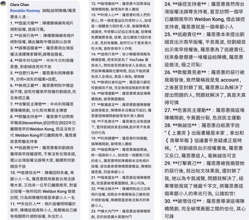 9. **逃避責任**:羅恩惠看到劉細良獲得南早授權證明,不單沒有兌現承諾,還以台灣版權法誤導大家,繼續死咬劉細良不放