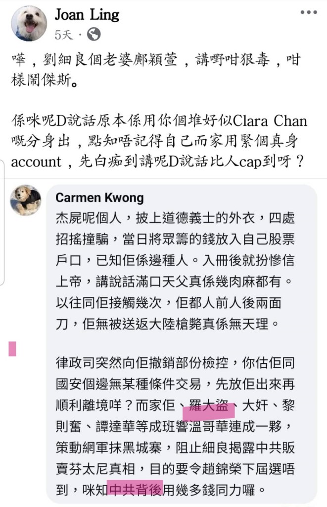 然後是向一眾仗義執言的人潑髒水。例如對我,就映射我「是中共地下黨,是安插在民主陣營中的『針』,專為中共收集情報,直到今天仍然如是」。對於徐少驊,就譏笑他是「佔中逃兵」,對於其他揭發他的前「拍檔」,就譏笑他們都是 loser,加起來的流量都不及劉細良一人,說甚麼沒有劉細良就沒有您們……等等。他這種「不解決問題,卻解決提出問題的人」的拙劣表演,同中共的手法如出一轍。