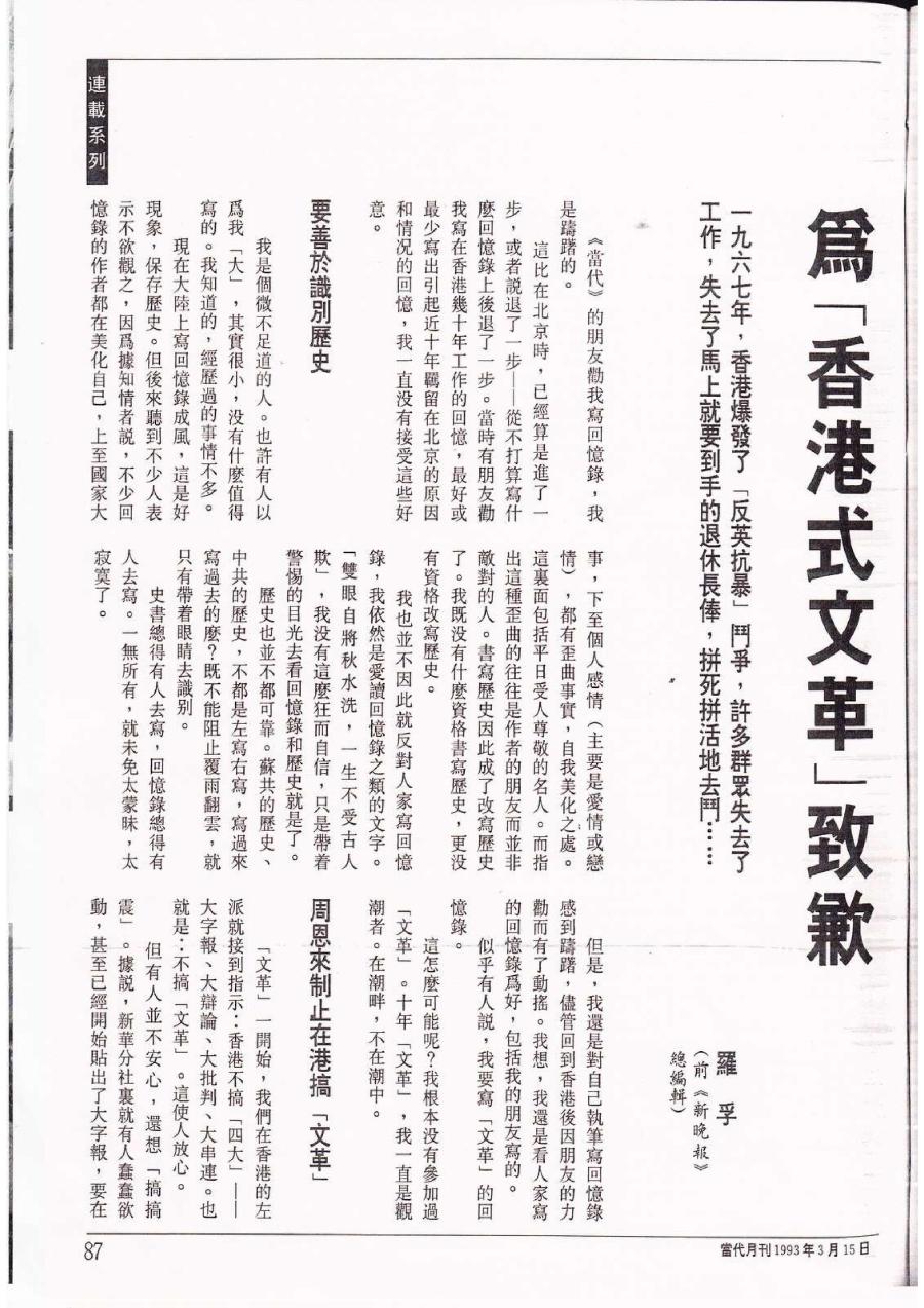 #羅孚 #為香港式文革致歉 #新晚報 #六七暴動 #反英抗暴 #當代月刊 #消失的檔案