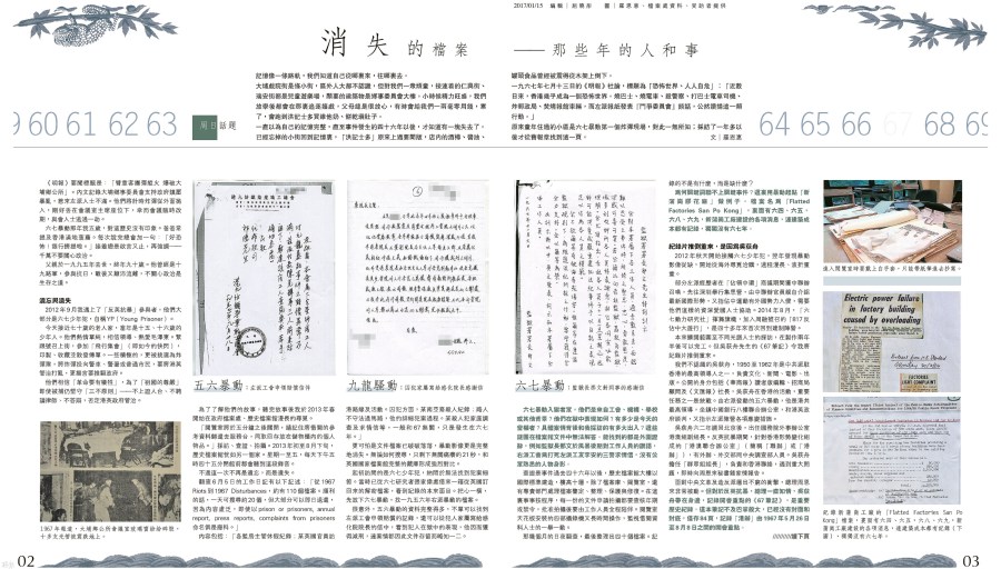 在官方檔案裏,1967,原來只餘全長廿一 秒的新聞處影片,片中是一堆行來行去的人。 大有街沒有了、膠花廠沒有了、摩星嶺集中營沒有了,幾吋厚的大型文件夾內,剩下無關痛 癢的薄薄一疊,關鍵資料一筆不留。