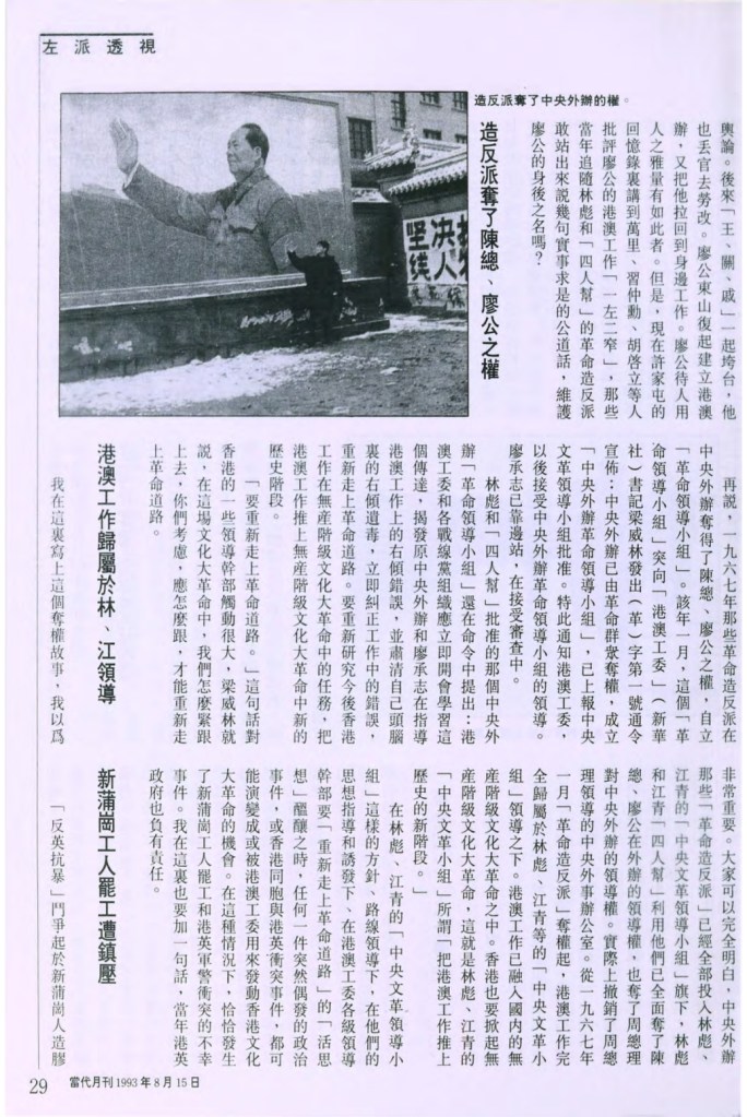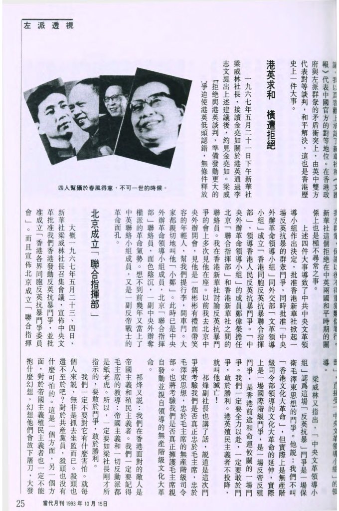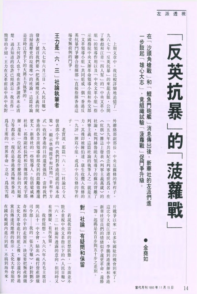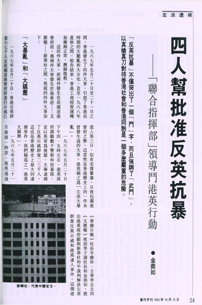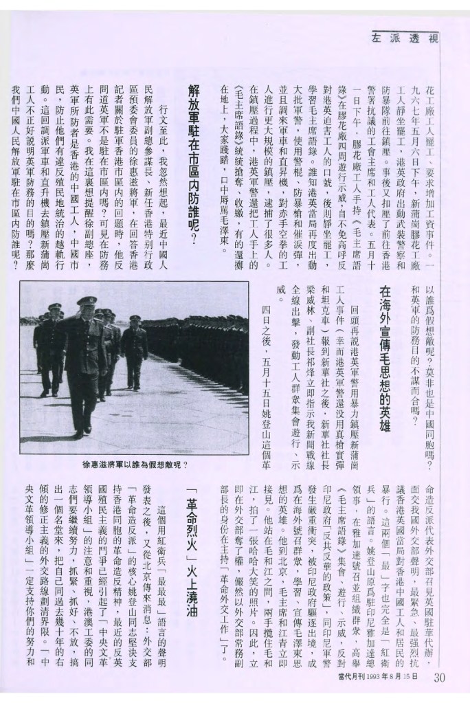 //在1967年的「反英抗暴」鬥爭中,香港新華社(即「中共港澳工委」)的指示是:輿論領先,發動群眾,組織起來,全面進攻。作為中共港澳工委新聞戰線的黨書記,我在那次文革式的極左盲動的「反英抗暴」鬥爭中當然站在第一線,對港英和對社會上,我的角色當然是「左先鋒」。……