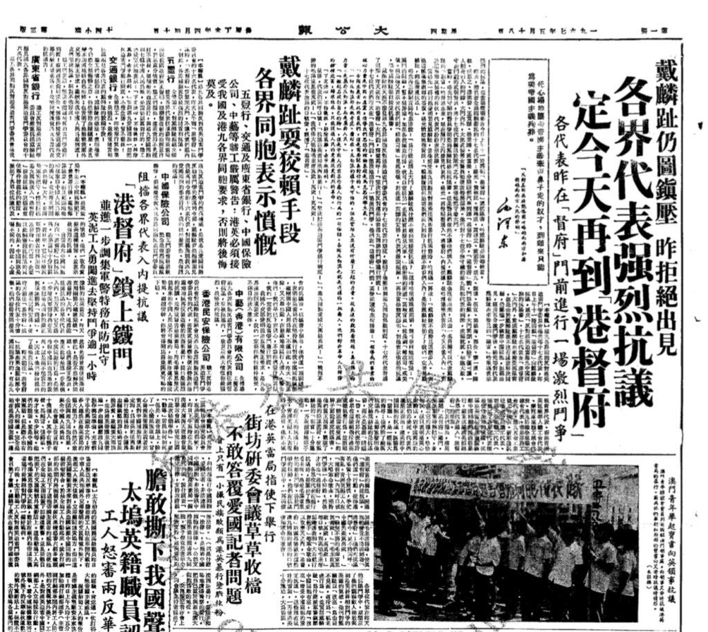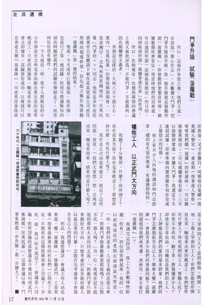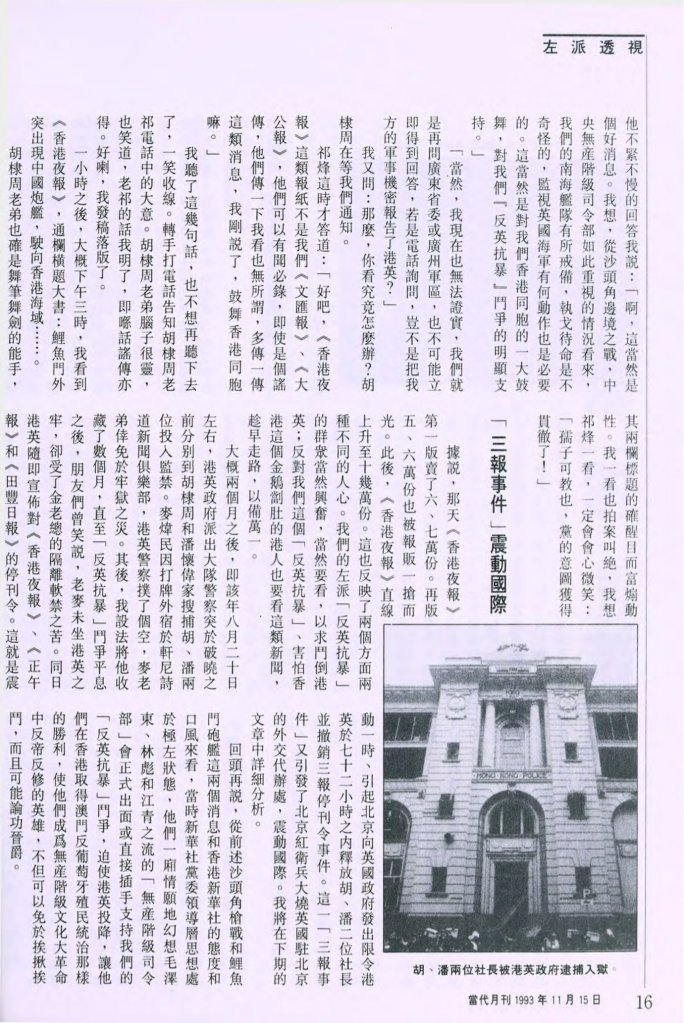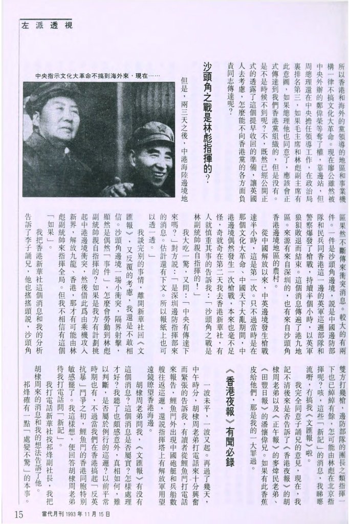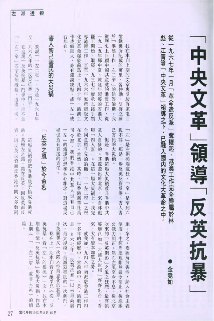 //在1967年的「反英抗暴」鬥爭中,香港新華社(即「中共港澳工委」)的指示是:輿論領先,發動群眾,組織起來,全面進攻。作為中共港澳工委新聞戰線的黨書記,我在那次文革式的極左盲動的「反英抗暴」鬥爭中當然站在第一線,對港英和對社會上,我的角色當然是「左先鋒」。……