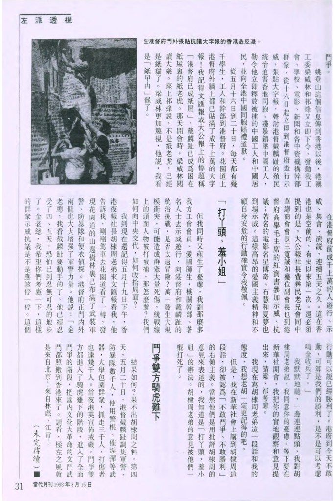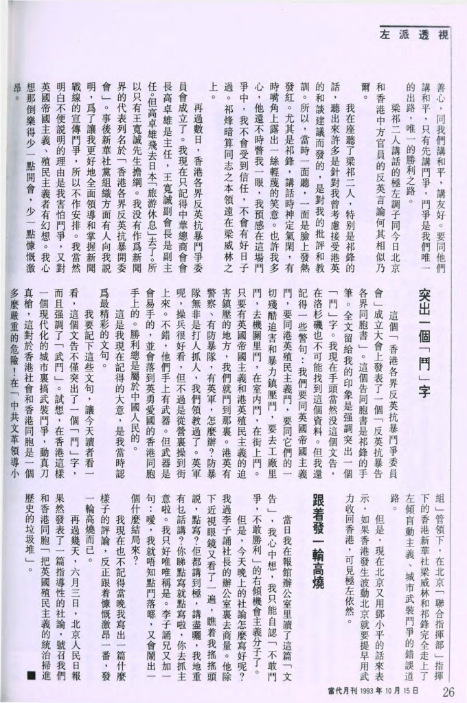 是的,文匯報和我的社論對香港社會和香港同胞貽害很大。這是我一生為革命工作中對人民最大的負疚。不過,我也要說明一點:在黨內,我有不同意見,我曾冒「喪失立場」、「喪失黨性」的危險向港澳工委領導人梁威林和祁烽,以及那個黃光宇的宣傳部多次表達過不同意見,甚至在一些重大的鬥爭場合上發表反對意見。//