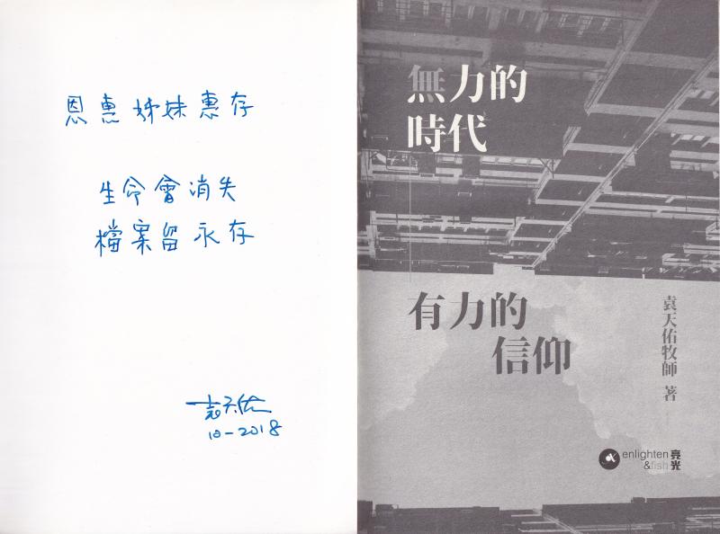2018年10月,《無力的時代,有力的信仰》出版,袁天佑寄語「生命會消失,檔案留永存」。