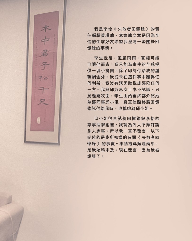 2021年底,李怡邀請瑾瑜「幫手做」回憶錄,2022年5月更確定編務範圍,瑾瑜即擔起責任編輯一職。2022年9月26日,李怡於深切治療部向黃瑾瑜託付重任,請她無論如何要將回憶錄編好,臨終前李怡從來沒有提及「口述代筆」。李怡10月5日去世。黃瑾瑜又指李怡撰寫有關《蘋果日報》篇章時,曾經表明「我也就提前在這裏寫《失敗者回憶錄》的尾段」,就是回憶錄的最終章。