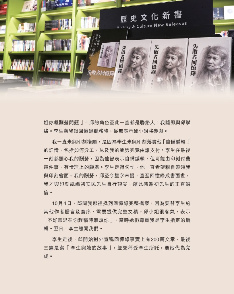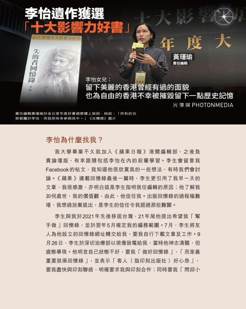 《失敗者回憶錄》責任編輯黃瑾瑜打破沉默,憶述李怡委託她編輯回憶錄的經過。