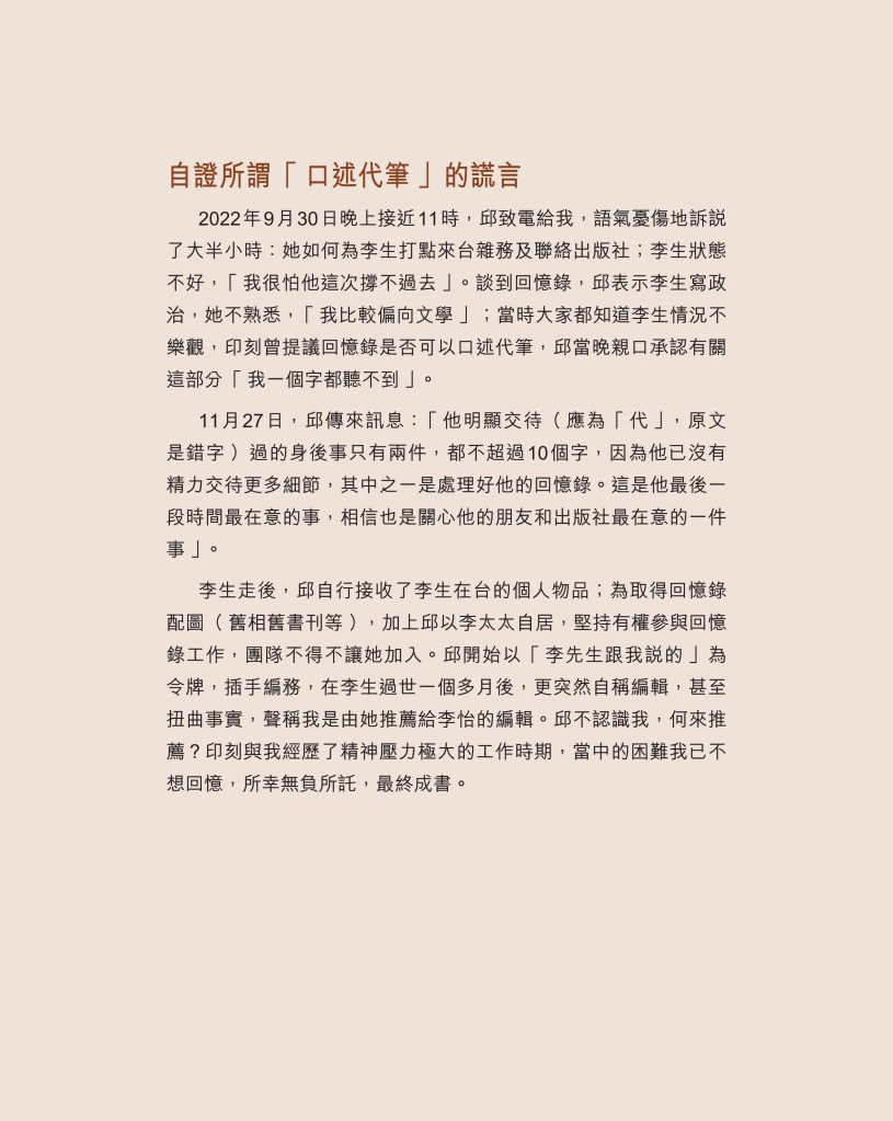 李怡走了,他不能再為我們指引或分析甚麼。李怡離開香港,不是由於他邦有吸引因素,而是此地不留人。大家竟會相信李怡撰寫這本一生中最重要的著作時、在香港及他的朋友蒙難時,會選擇記述他如何享受異地生活?如何發展黃昏戀?還公開自己的病況?各位有看李怡的文章嗎?他親筆記述最討厭談及病情。這是回憶錄,不是自傳。