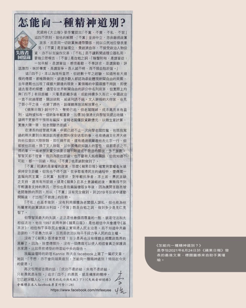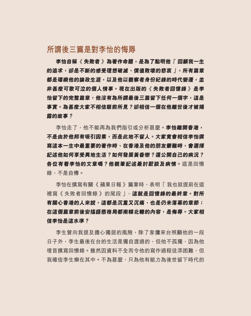 李怡在撰寫有關《蘋果日報》篇章時,表明「我也就提前在這裡寫《失敗者回憶錄》的尾段」,這就是回憶錄的最終章。對所有關心香港的人來說,這都是沉重又沉痛、也是仍未落幕的章節;在這個篇章前後安插語態格局都南轅北轍的內容,是侮辱。大家相信李怡是這水準? ……