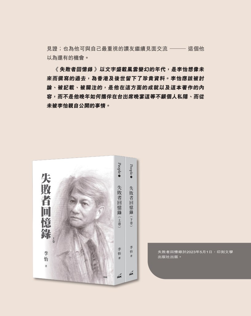 《失敗者回憶錄》以文字盛載風雲變幻的年代,是李怡想像未來而撰寫的過去,為香港及後世留下了珍貴資料。李怡應該被討論、被記載、被關注的,是他在這方面的成就以及這本著作的內容,而不是他晚年如何攜伴在台出席晚宴這等不顧個人私隱、而從未被李怡親自公開的事情。//