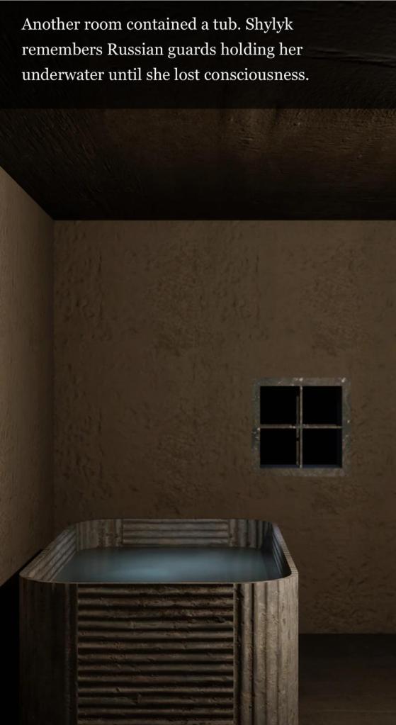 房間裡有一個浴缸,Shylyk記得俄羅斯警衛將她按在水下,直到她失去意識。她被警棍的刺痛聲吵醒。她說警衛打斷了她的四根肋骨。