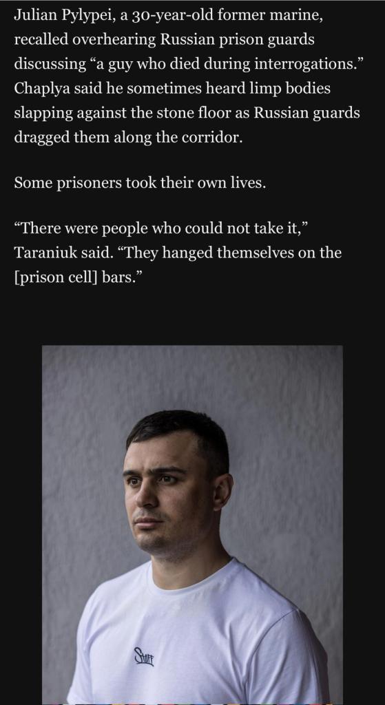 30 歲的前海軍陸戰隊員Julian Pylypei回憶說,他無意中聽到俄羅斯獄警討論「一名在審訊中死亡的人」。前戰浮 Mykhailo Chaplya說,他有時會聽到俄羅斯警衛拖著屍體沿著走廊走,屍體在石頭地板上發出拍打的聲音。Taraniuk說「有些人無法接受,就在牢房的鐵欄上上吊自殺了。」