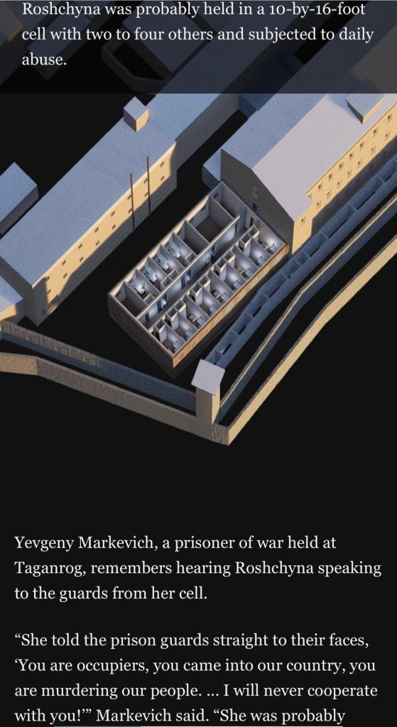 被關在塔甘羅格的戰俘Yevgeny Markevich聽到Roshchyna在牢房裡與警衛對話。「她當面對獄警說,『你們是佔領者,你們闖入我們的國家,你們正在屠殺我們的人民…我永遠不會與你們合作!』」Markevich很震驚:「她可能因為自己是女人才這樣說。如果我說了那樣的話,他們肯定會當場殺了我。」