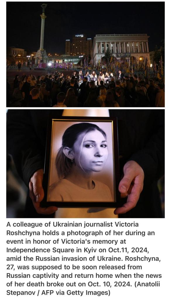 2024年10月11日,Viktoriia Roshchyna的同業們200百多人聚集在基輔獨立廣場悼念。他們手持她的照片緬懷她。有行家說:「Roshchyna是那種不會等待編輯派遣任務的記者,一旦有事發生就會趕到現場。無論是抗議、衝突還是犯罪現場,她都勇於接受艱鉅挑戰。」