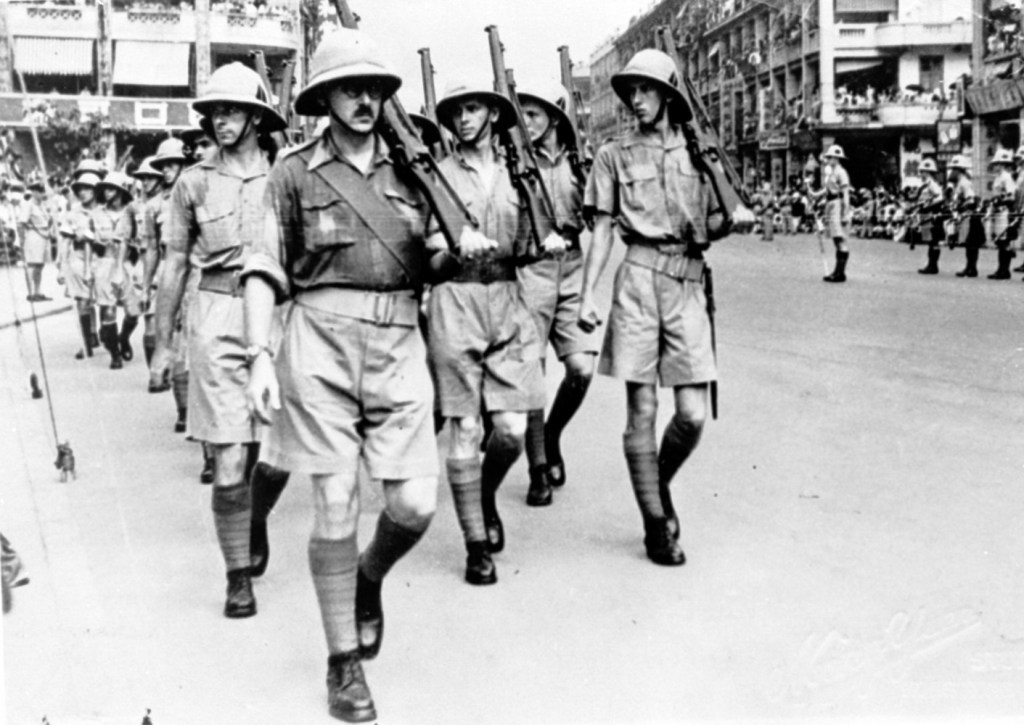 1941年,香港義勇軍在灣仔修頓球場外步操,他們由多個連隊組成,均視香港為家。(政府檔案處照片)