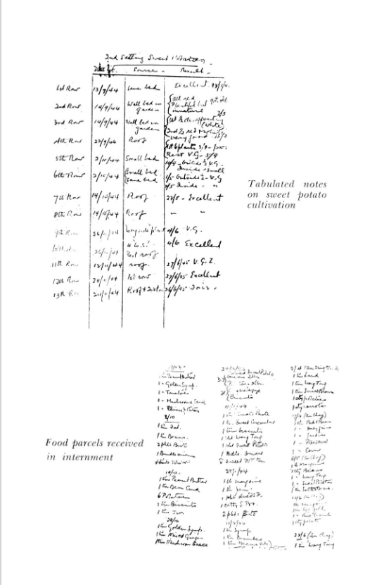 Jean在拘留營記下的種植及收取食物記錄。(”Eastern Windows-Western Skies”圖片)
