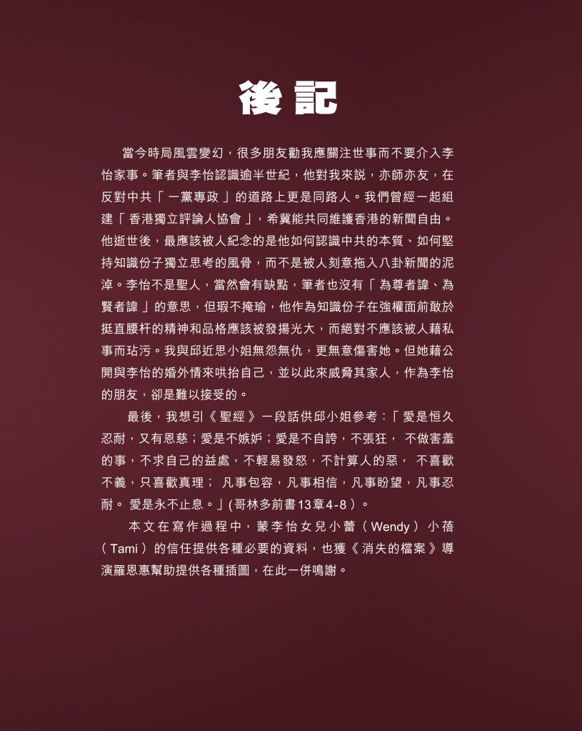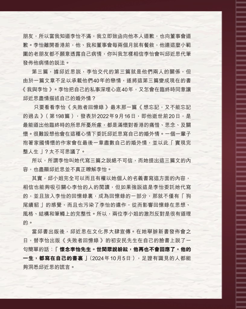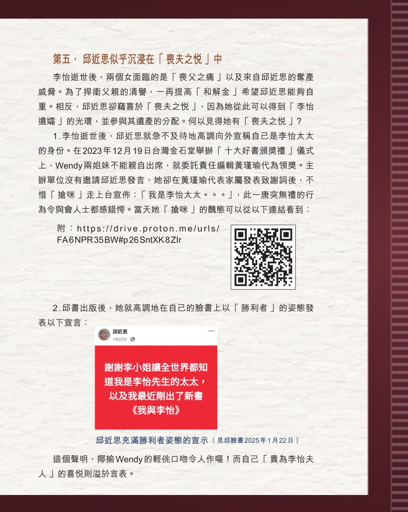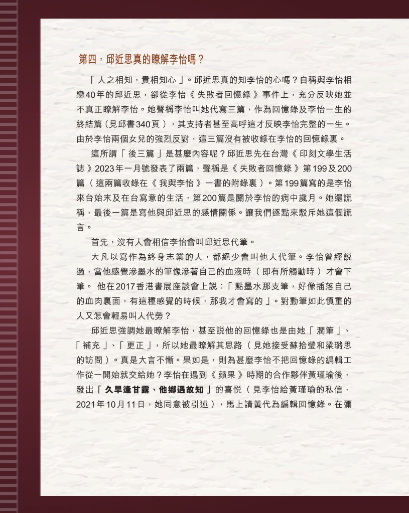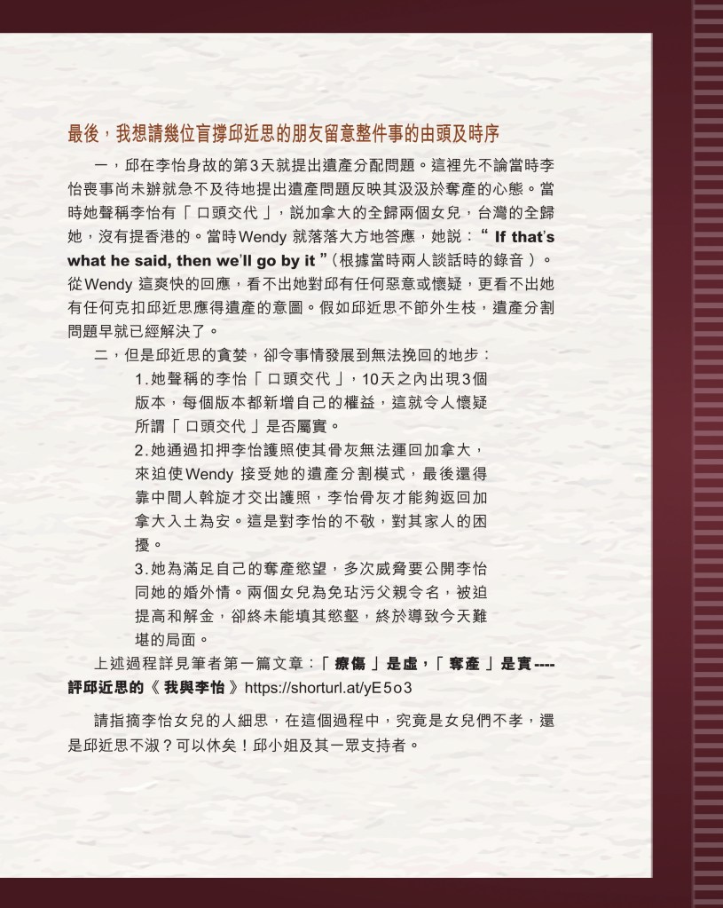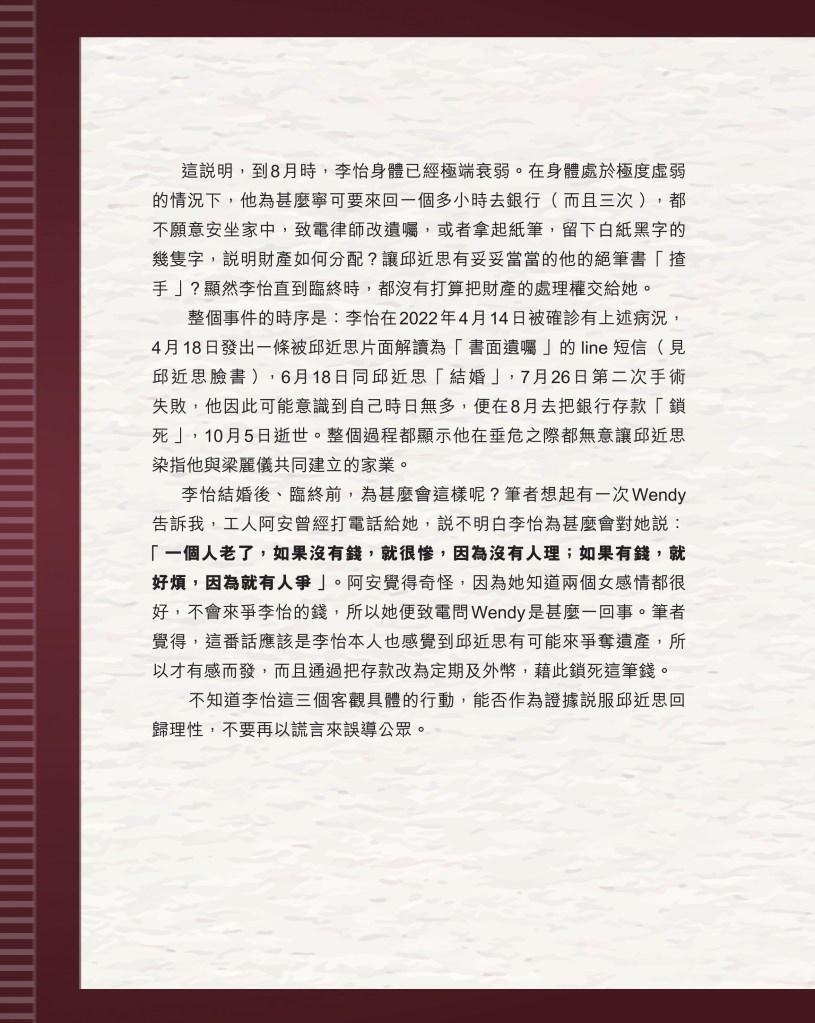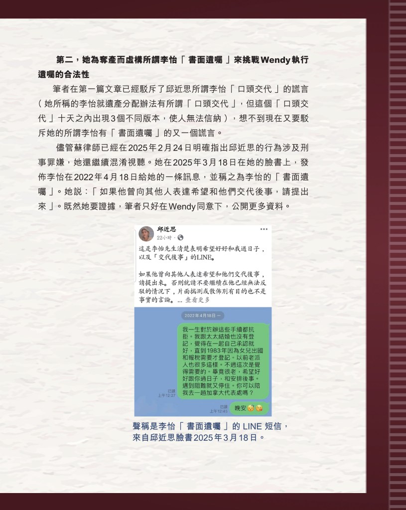 筆者寫完<「療傷」是虛,「奪產」是實 — 評邱近思的《我與李怡》>(以下簡稱「邱書」)一文後,本以為在客觀事實面前,是非對錯已經十分明顯,無需再跟進,不料先是殷惠敏先生賜我鴻文<別鬧啦!程翔先生>(以下簡稱「殷文」),繼而邱本人又對Wendy (李小蕾,李怡長女) 發表了8點回應,(全文詳見台灣《上報》2025年4月1日),並且向她的支持者發放一封李怡與女兒Wendy的私人信件,用以證明女兒的不孝,令他們紛紛發文譴責女兒(見蘇賡哲4月20日臉書及其留言)。必須指出,這是她擅自登入李怡平板電腦後偷窺到的李怡私人信件,並把它公開,其行為本身十分缺德。這些發展使我驚嘆原來邱近思及其朋友們,都可以罔顧其自我暴露奪產的心態(見諸《我與李怡》・ <遺憾>一章),無視其藉公開李怡私隱來威脅兩個女兒的敗德,更不理會其擅自提取銀行存款構成刑事罪嫌的劣行而仍然盲撐她。嗟夫,《荀子・性惡篇》有之:「今與不善人處,則所聞者欺誣、詐偽也,所見者污漫、淫邪、貪利之行也,身且加於刑戮而不自知者,靡使然也。傳曰:『不知其子視其友,不知其君視其左右』。靡而已矣!靡而已矣!」荀子這番話,前半段用在邱近思身上,後半段用在殷先生及其一類的支持者身上,都十分貼切。