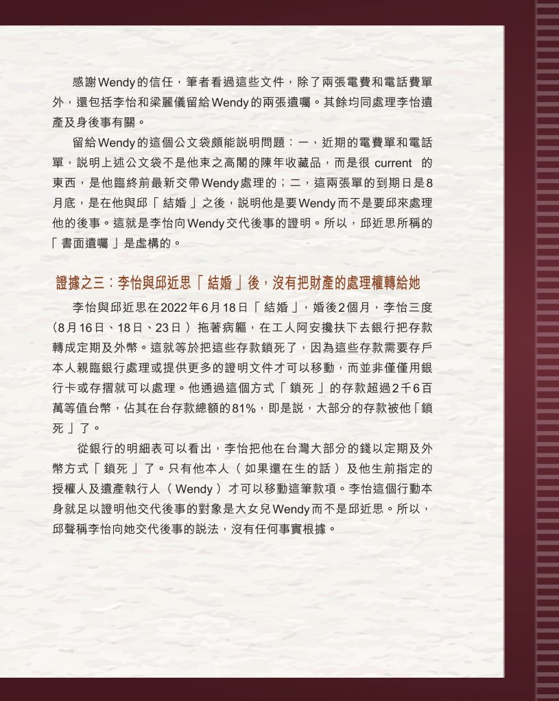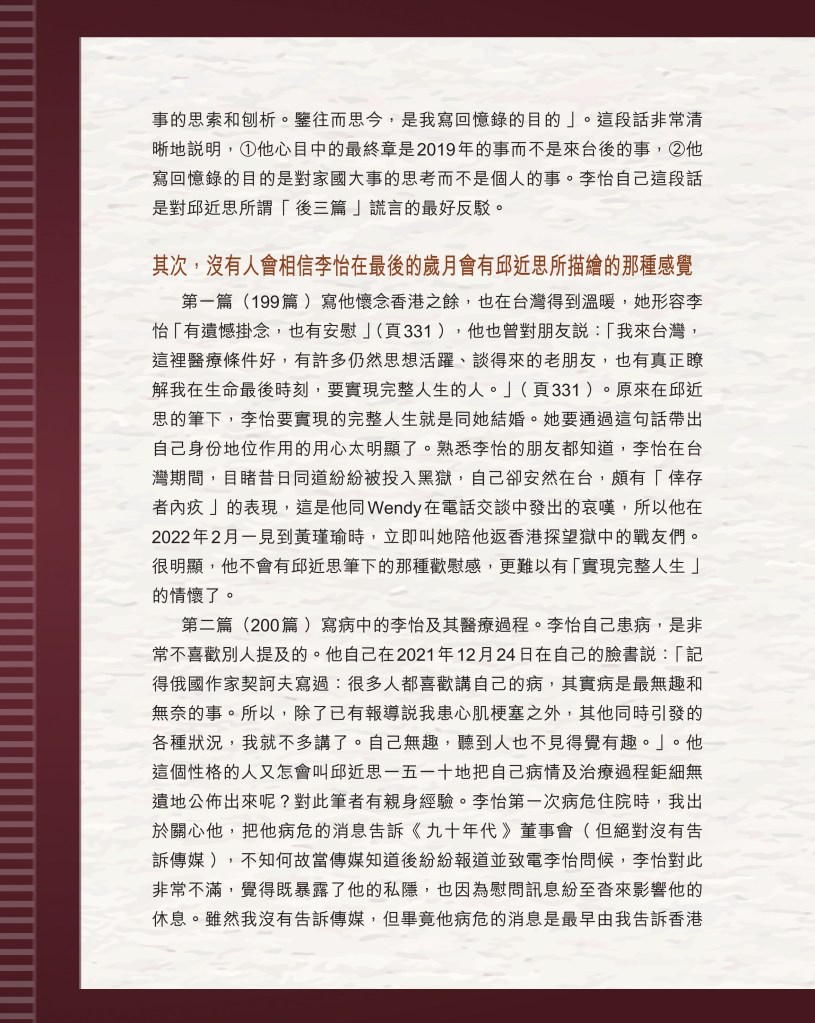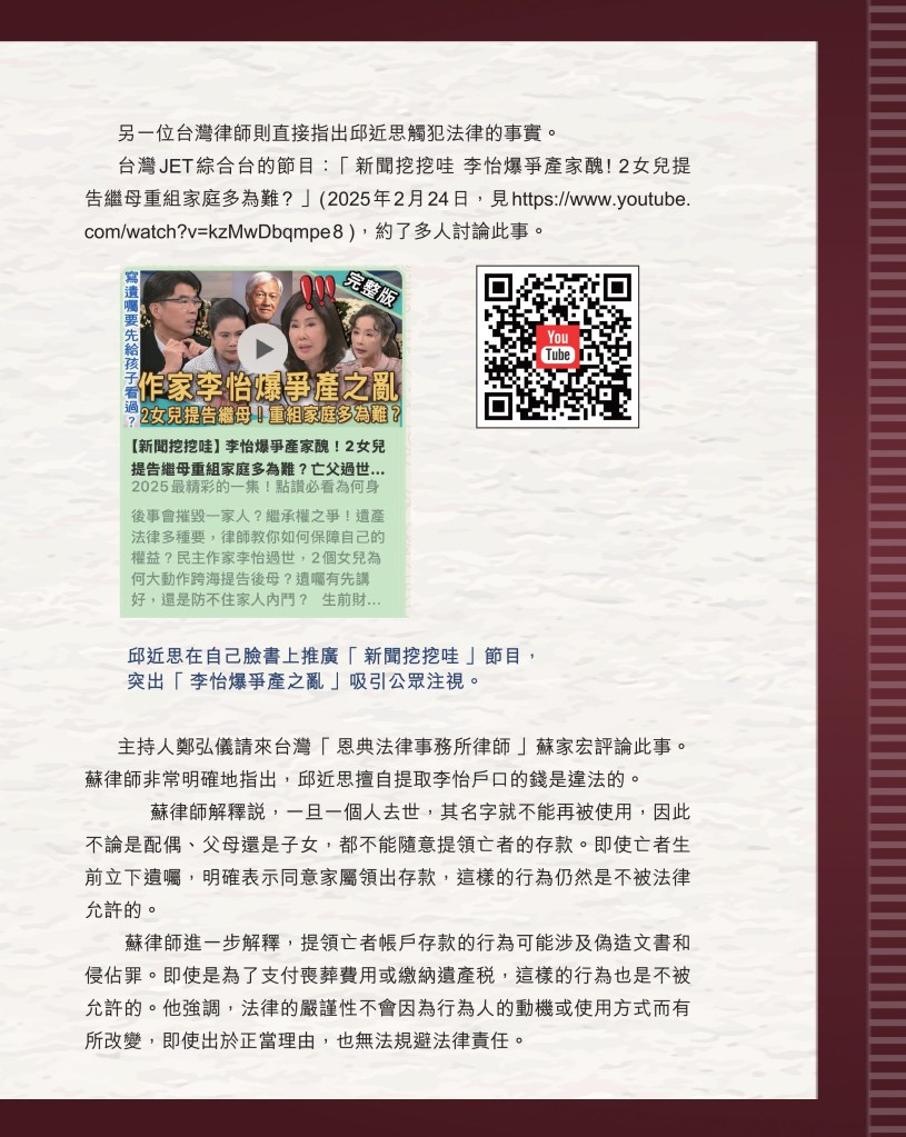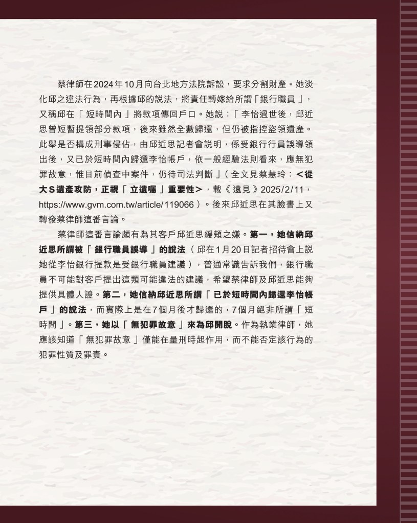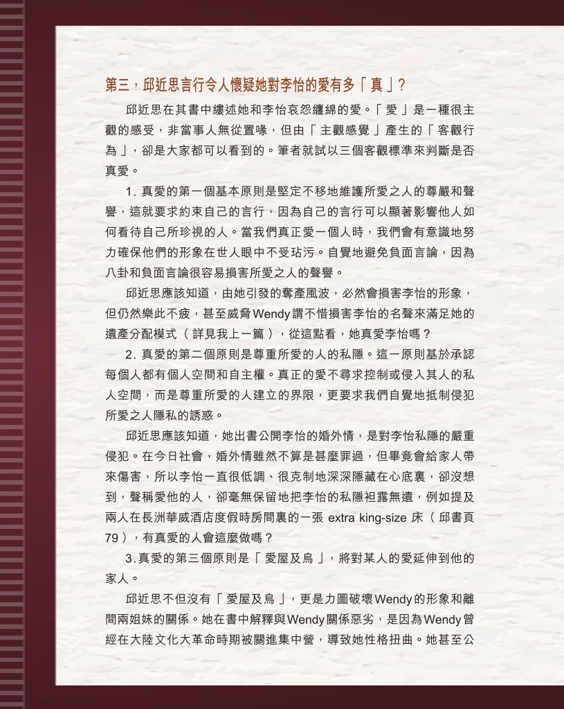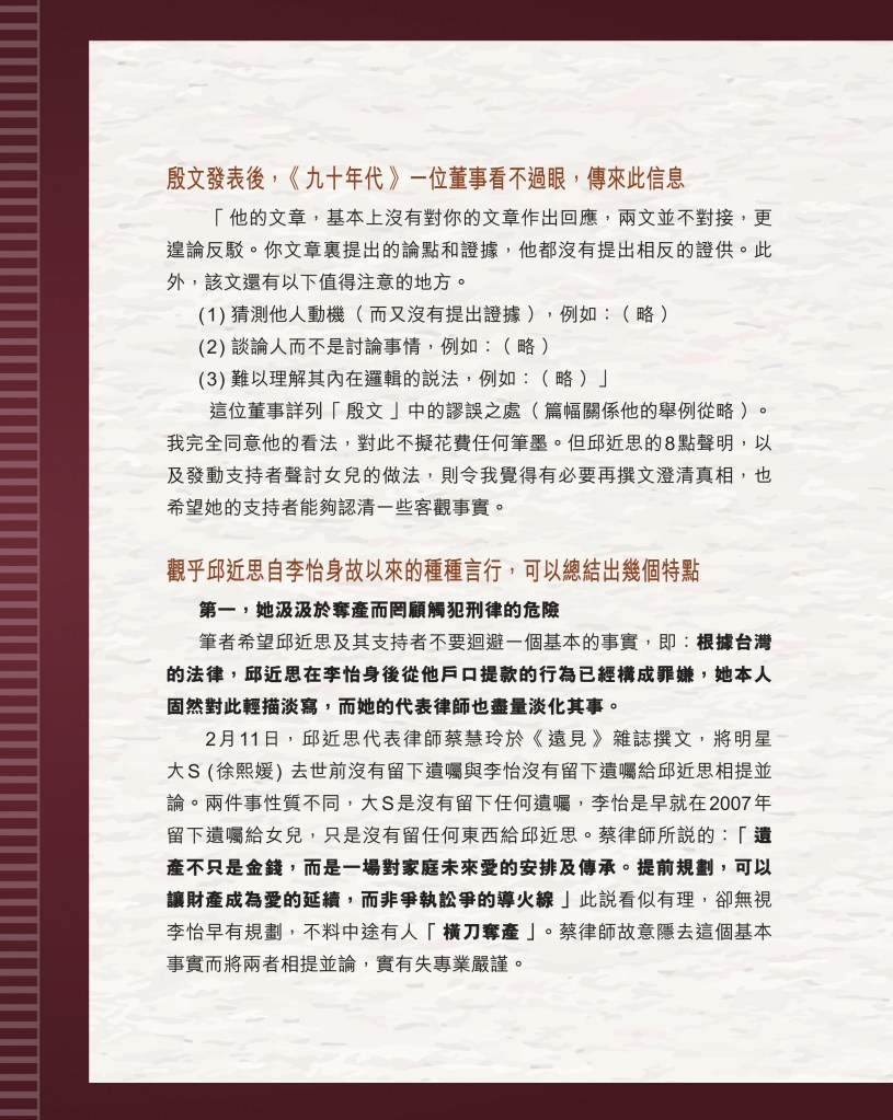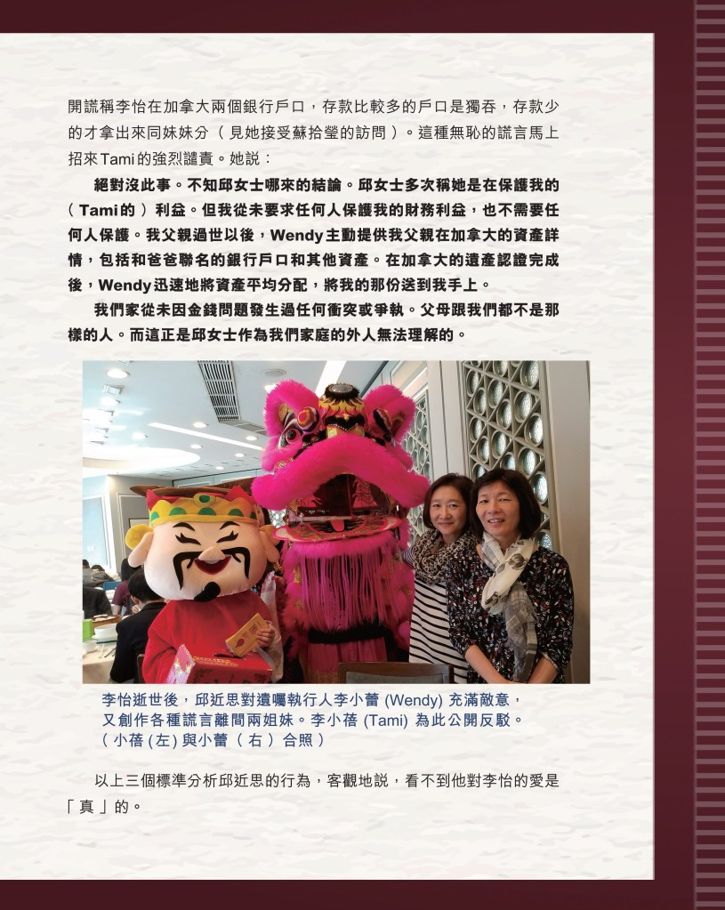 筆者寫完<「療傷」是虛,「奪產」是實 — 評邱近思的《我與李怡》>(以下簡稱「邱書」)一文後,本以為在客觀事實面前,是非對錯已經十分明顯,無需再跟進,不料先是殷惠敏先生賜我鴻文<別鬧啦!程翔先生>(以下簡稱「殷文」),繼而邱本人又對Wendy (李小蕾,李怡長女) 發表了8點回應,(全文詳見台灣《上報》2025年4月1日),並且向她的支持者發放一封李怡與女兒Wendy的私人信件,用以證明女兒的不孝,令他們紛紛發文譴責女兒(見蘇賡哲4月20日臉書及其留言)。必須指出,這是她擅自登入李怡平板電腦後偷窺到的李怡私人信件,並把它公開,其行為本身十分缺德。這些發展使我驚嘆原來邱近思及其朋友們,都可以罔顧其自我暴露奪產的心態(見諸《我與李怡》・ <遺憾>一章),無視其藉公開李怡私隱來威脅兩個女兒的敗德,更不理會其擅自提取銀行存款構成刑事罪嫌的劣行而仍然盲撐她。嗟夫,《荀子・性惡篇》有之:「今與不善人處,則所聞者欺誣、詐偽也,所見者污漫、淫邪、貪利之行也,身且加於刑戮而不自知者,靡使然也。傳曰:『不知其子視其友,不知其君視其左右』。靡而已矣!靡而已矣!」荀子這番話,前半段用在邱近思身上,後半段用在殷先生及其一類的支持者身上,都十分貼切。