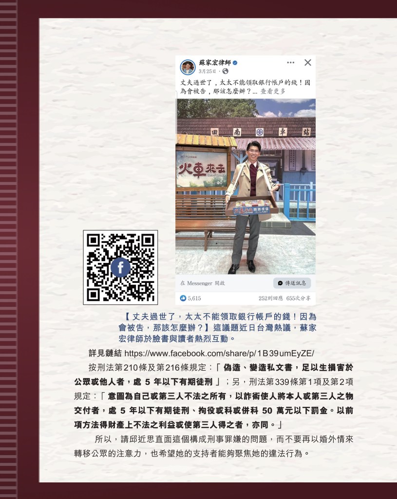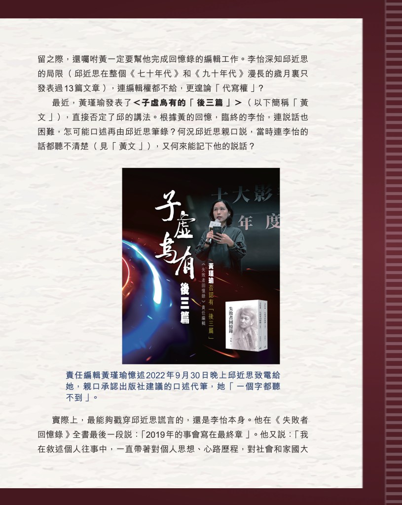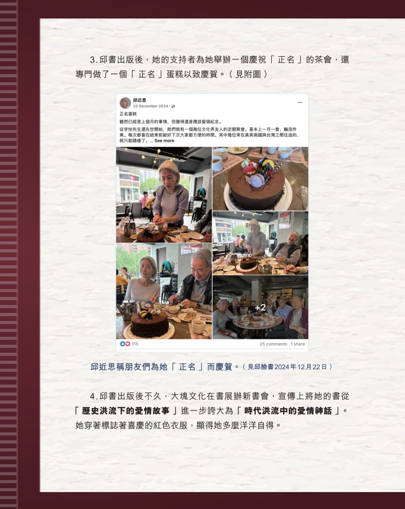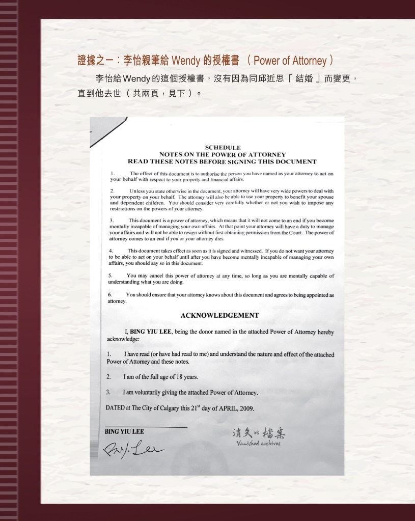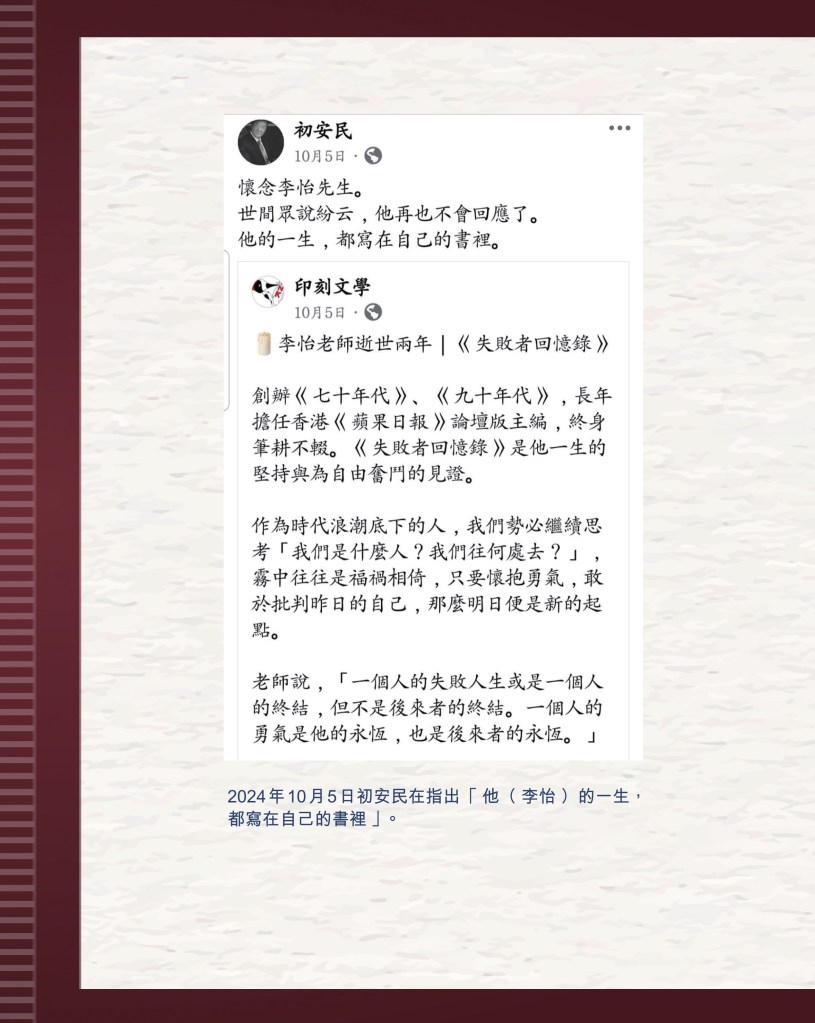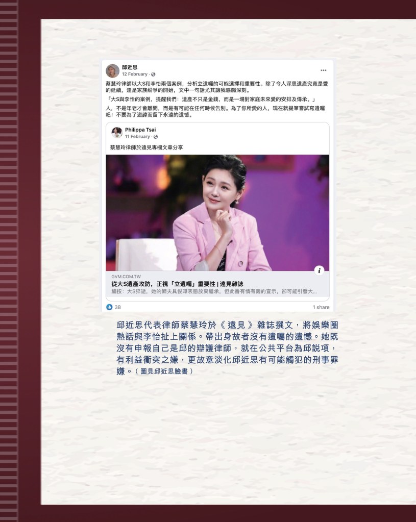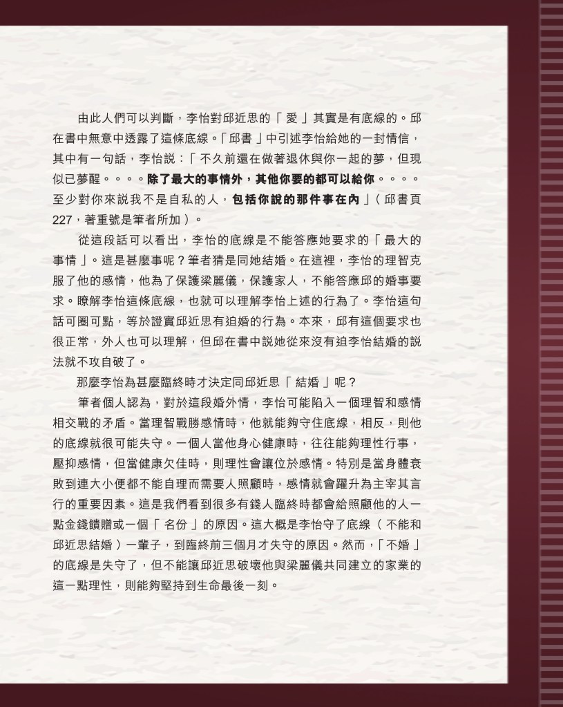 筆者寫完<「療傷」是虛,「奪產」是實 — 評邱近思的《我與李怡》>(以下簡稱「邱書」)一文後,本以為在客觀事實面前,是非對錯已經十分明顯,無需再跟進,不料先是殷惠敏先生賜我鴻文<別鬧啦!程翔先生>(以下簡稱「殷文」),繼而邱本人又對Wendy (李小蕾,李怡長女) 發表了8點回應,(全文詳見台灣《上報》2025年4月1日),並且向她的支持者發放一封李怡與女兒Wendy的私人信件,用以證明女兒的不孝,令他們紛紛發文譴責女兒(見蘇賡哲4月20日臉書及其留言)。必須指出,這是她擅自登入李怡平板電腦後偷窺到的李怡私人信件,並把它公開,其行為本身十分缺德。這些發展使我驚嘆原來邱近思及其朋友們,都可以罔顧其自我暴露奪產的心態(見諸《我與李怡》・ <遺憾>一章),無視其藉公開李怡私隱來威脅兩個女兒的敗德,更不理會其擅自提取銀行存款構成刑事罪嫌的劣行而仍然盲撐她。嗟夫,《荀子・性惡篇》有之:「今與不善人處,則所聞者欺誣、詐偽也,所見者污漫、淫邪、貪利之行也,身且加於刑戮而不自知者,靡使然也。傳曰:『不知其子視其友,不知其君視其左右』。靡而已矣!靡而已矣!」荀子這番話,前半段用在邱近思身上,後半段用在殷先生及其一類的支持者身上,都十分貼切。