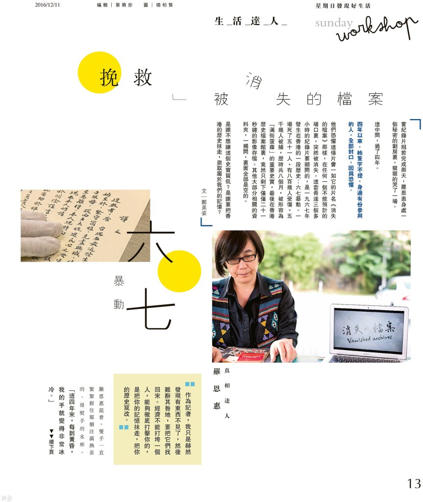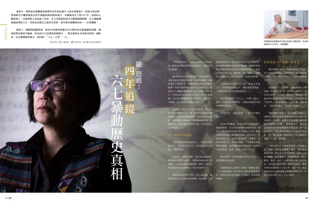 羅恩惠對真相的執着近乎潔癖,筆下每個情節都用很多力氣從海量資料中爬梳出來。製作紀錄片的四年中有八個月,她像上班一樣差不多天天跑歷史檔案館,從早到晚查證六七暴動的事實。惟事實已經消失。