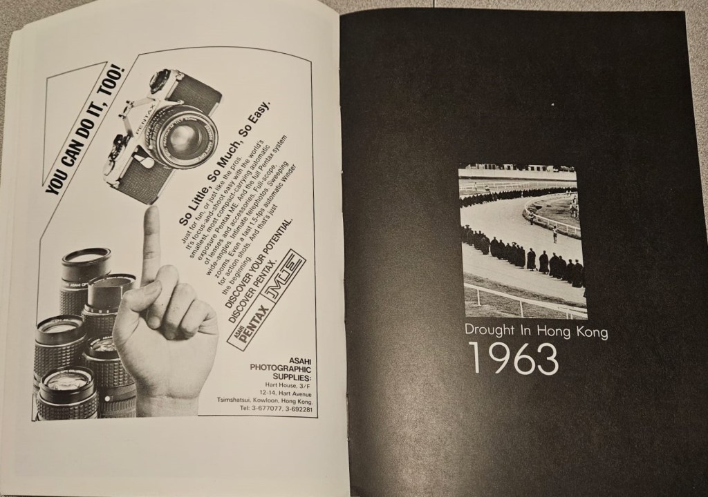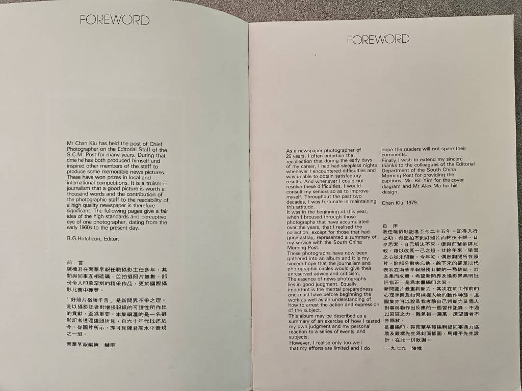 「我任職攝影記者至今二十五年。記得入行之初,每因拍不到好照片而終夜不眠,日夕思索,自己解決不來,便與前輩參詳比較,藉以改良一己之短。廿餘年來,學習之心從未間斷。今年初,偶然翻閱所存照片,除部分散失忘佚,餘下來的卻足以代表我在南華早報服務廿載的一點總結,於是集而成册,希望新聞界及攝影界高明批評指正,是為本書編印之旨。