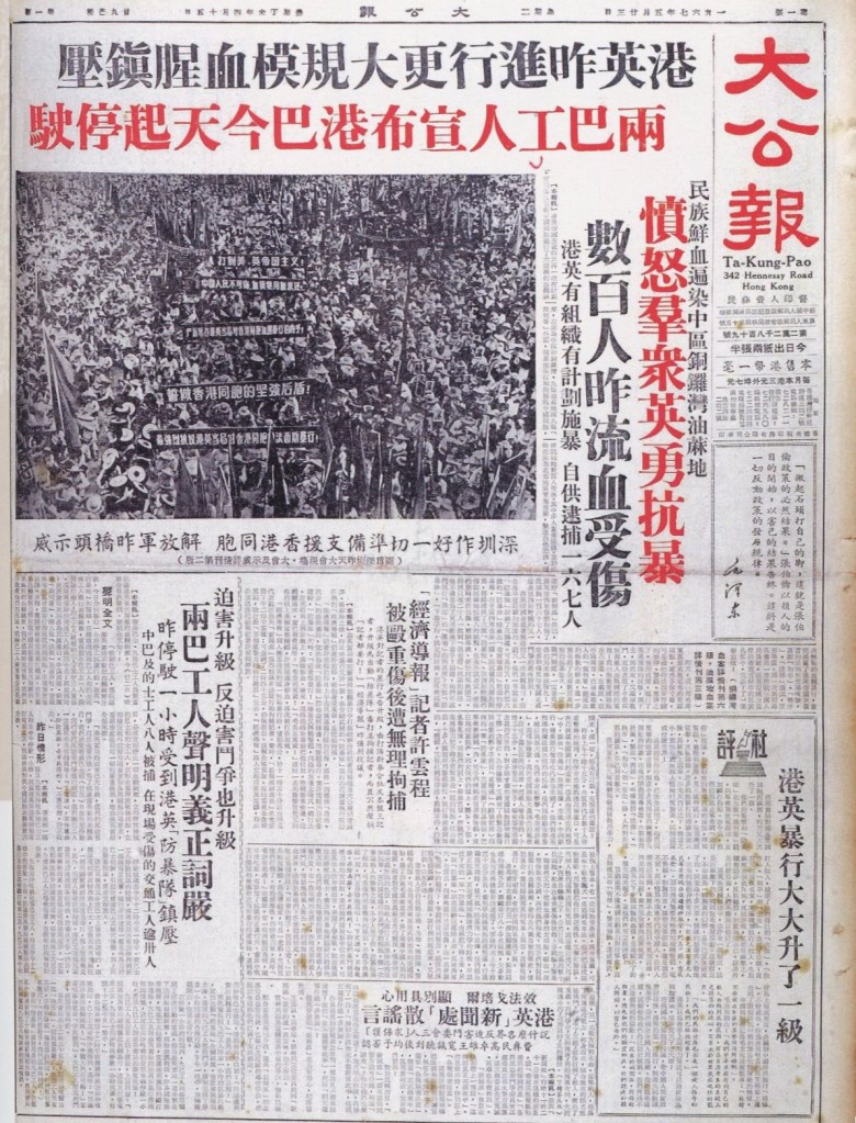 左派組織動員了自己的所有力量,進行抗議集會和上街示威,67年6月下旬開始各業工人的「聯合大罷工」,接著又舉行各行業的「聯合罷市」四天。港英也不示弱,似乎要決心較量一番,除了施放催淚彈驅散集會和毆捕群眾之外,還發動防暴隊圍攻「港九樹膠業工會」,「九龍船塢勞工聯合會」,「港九工會聯合會俱樂部」等處,甚至派出直升機運兵降落「僑冠大廈」,對居民大廈進行襲擊。據當時各界鬥委會出版的《香港風暴》畫冊載稱:「自從五月上旬開始,僅僅在五個多月內,(港英)已殺害我同胞二十多人,非法毆打,逮捕、審訊、秘密綁架四千多人、橫加罪名投入黑獄二千多人。」這就是左派方面的總結。