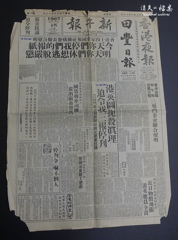 港英對左派的《大公報》、《文匯報》、《新晚報》等沒有採取封閉的手段,而是轉了一個彎,向左派的外圍報紙下手。1967年8月9日,港英當局逮捕了《香港夜報》社長胡棣周、《田豐日報》社長潘懷偉、督印人陳娟娟(女),南昌印務公司董事長李少雄、經理翟暖暉(該印務公司承印上述兩報和《香港商報》等)共五人,以「刊登煽動性文字」的罪名起訴。並宣布將《香港夜報》、《田豐日報》、《新午報》三家報紙停刊半年,另罰款四萬二千元。