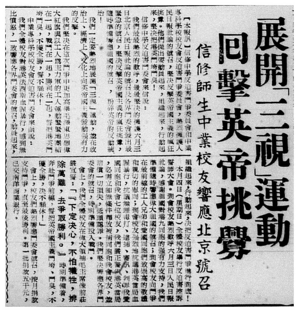 北京《人民日報》是中共中央機關報,其言論是有代表性的,其中6月3日那篇社論更具有指導性作用。社論號召港九各界同胞「採取一切可能的方法,對萬惡的英帝國主義展開猛烈衝擊」,提出「你升級,我也升級」,並作出指示:「展開一場仇視、鄙視、蔑視英帝國主義的運動。」(即所謂「三視」運動)。