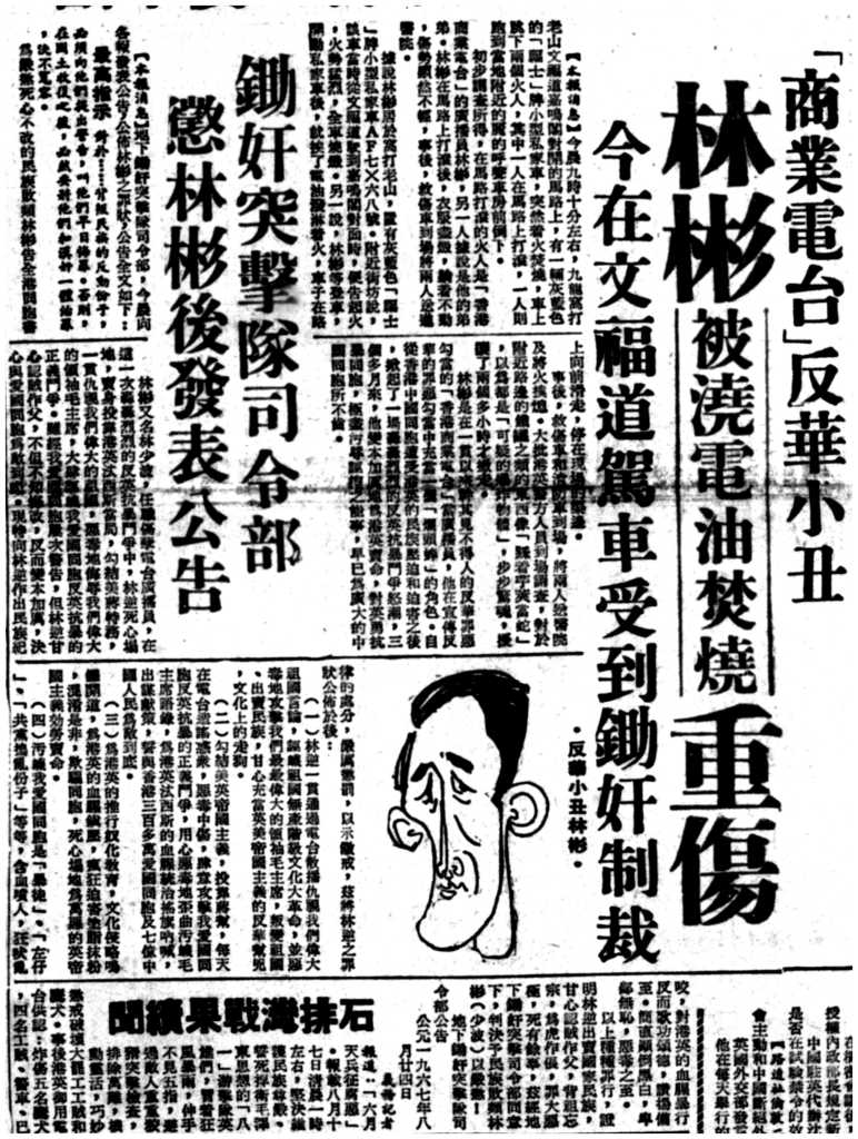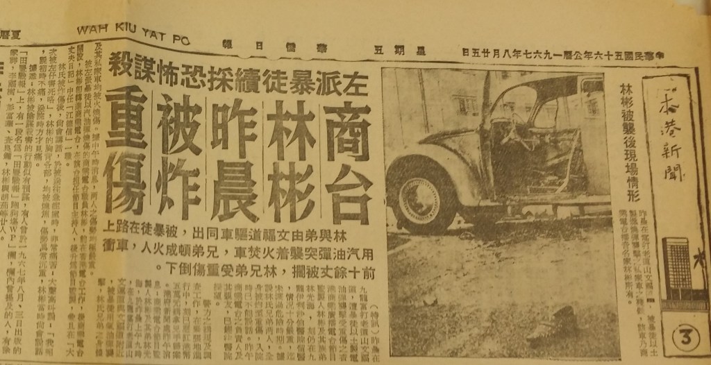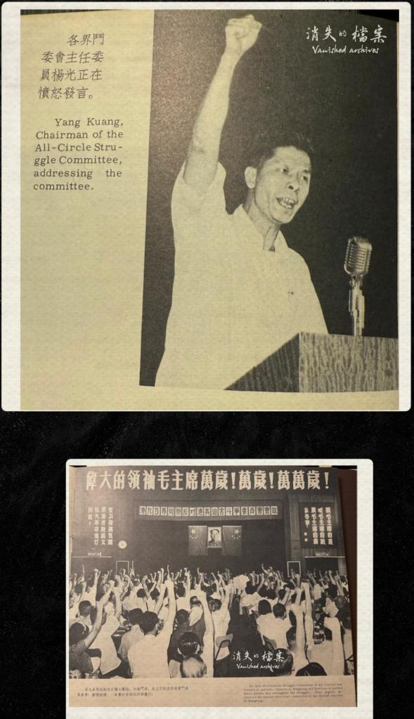 「當時楊光是工聯會理事長、鬥委會主任,領導、號召各社團罷工罷市、滿街擺放真假炸彈。最失民心是炸彈擺放位置不止於政府機構,尚有電車站、兒童遊樂場、戲院、郵局、碼頭、銀行。拆彈專家及警方疲於奔命,市民陷入極大恐慌。單是7月28日,擺放炸彈的位置就有十七處之多。8月下旬,兩名稚齡姐弟在北角清華街誤觸炸彈被炸死;林彬及其堂弟被左派人士活活燒死⋯⋯」