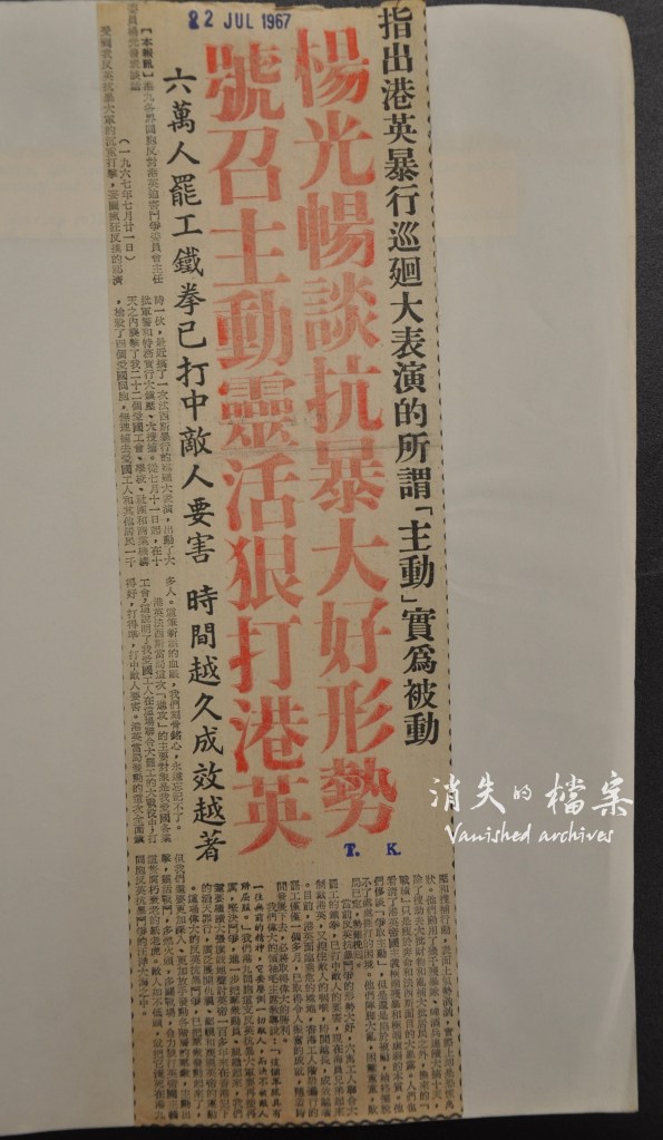 在官方檔案裏,1967,原來只餘全長廿一 秒的新聞處影片,片中是一堆行來行去的人。 大有街沒有了、膠花廠沒有了、摩星嶺集中營沒有了,幾吋厚的大型文件夾內,剩下無關痛 癢的薄薄一疊,關鍵資料一筆不留。