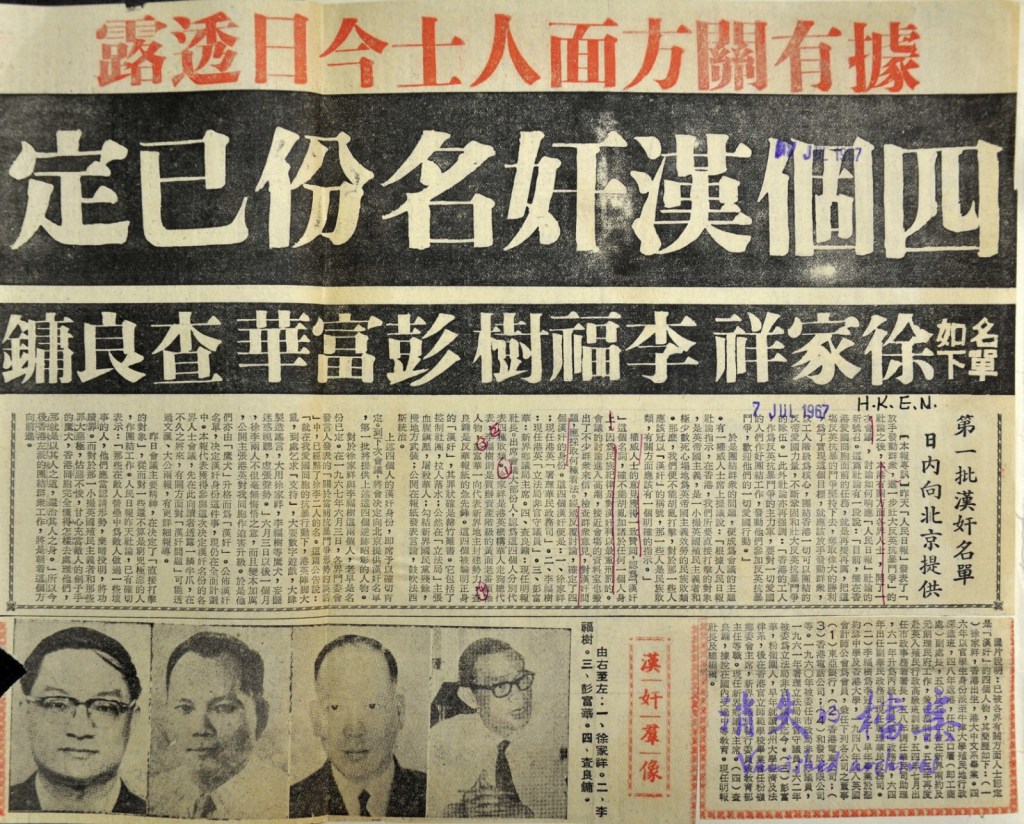第一批漢奸名單 日內向北京提供《新午報》1967年7月7日